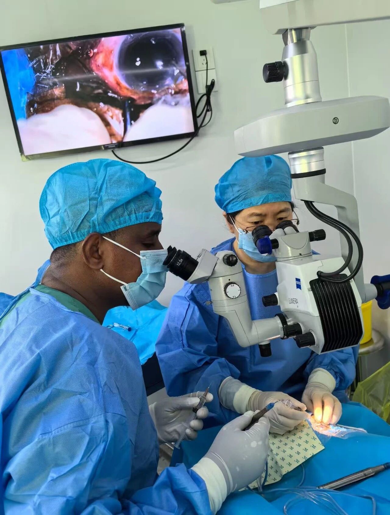 “七步洗手法要揉搓至少15次,每个指缝都不能放过。”张晋护士手把手地示范,从洗手液的取用到流水的冲洗方向,每个细节都不容有失,一遍又一遍的培训,直到合格为止,穿手术衣时,她一遍遍纠正Ibrahim的动作:“手要举高,不能低于腰部,转身时保持距离。”柴飞燕大夫则守候在手术台旁,时刻关注着Ibrahim的无菌操作,从戴手套、铺单、递器械、点水开始一点一点的强调无菌意识,慢慢的教会了如何装置人工晶状体,每一步操作都用心去交流,用行动去教诲,时刻关注着无菌观念和操作方式,一旦发现违规立即指出加以强调并且改正。