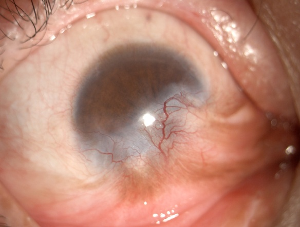 术前 约2/3角膜缘干细胞功能障碍,下方 术后翼状胬肉切除,睑球粘连分离,及鼻侧角膜结膜化、翼状胬肉增生、睑球2:30-8:30位角膜缘植片贴附良好粘连。