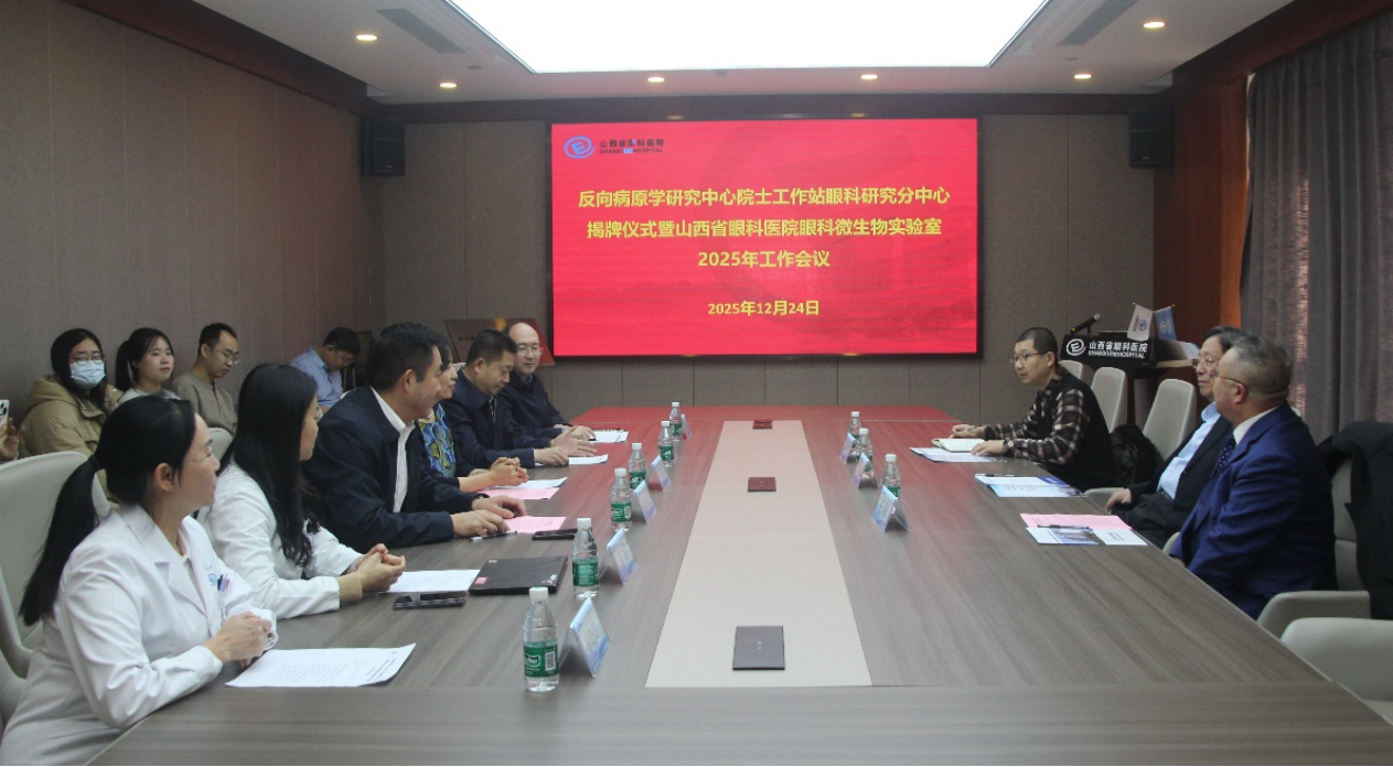 近日,山西省眼科医院隆重举行“反向病原学研究中心院士工作站 - 眼科研究分中心”授牌仪式,并同步召开眼科微生物研究基地 2025 年度工作会议。本次活动旨在深耕眼部微生物研究领域,探索眼科科研创新发展新路径,推动眼科医学研究与临床应用的深度融合。中国疾病预防控制中心传染病溯源预警与智能决策全国重点实验室主任徐建国院士、山西医科大学公共卫生学院王彤院长、中国疾病预防控制中心郑翰研究员莅临指导。山西省眼科医院党委书记李俊红教授、院长周国宏教授、纪委书记李旭光出席会议,医院人事科、科教科、综检科和实验室全体成员参会。