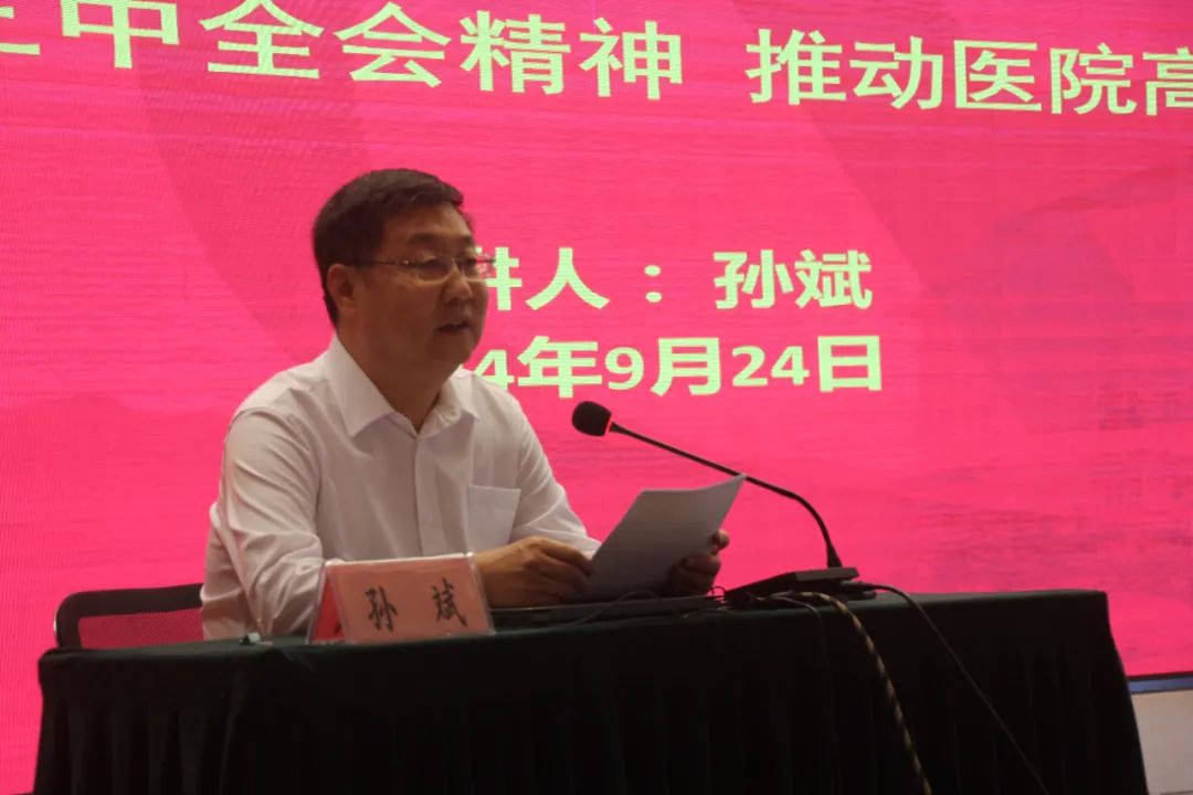 孙斌书记以《贯彻二十届三中全会精神 推动医院高质量发展》为题,紧紧围绕习近平总书记在党的二十届三中全会上的重要讲话和全会《决定》,全面深刻阐述了二十届三中全会精神的重大意义和全会在深化医药卫生体制改革方面的重点任务,为我们下一步深入学习贯彻全会精神指明了方向,提供了遵循。 会议强调,党的二十届三中全会是在以中国式现代化全面推进强国建设、民族复兴伟业的关键时期召开的一次十分重要的会议。全会通过的《决定》,是新时代新征程上推动全面深化改革向广度和深度进军的总动员、总部署。《决定》把深化医药卫生体制改革作为进一步全面深化改革、推进中国式现代化的一项重要任务予以部署,充分体现了以习近平同志为核心的党中央维护人民健康的坚定决心。深入学习贯彻党的二十届三中全会精神,对于我们深刻领悟“两个确立”的决定性意义,增强“四个意识”、坚定“四个自信”、做到“两个维护”,具有重大而深远的意义。全院广大党员干部要深入理解、全面把握党的二十届三中全会精神,深化理论武装,真正把进一步全面深化改革的战略部署转化为推动我院高质量发展的磅礴力量。