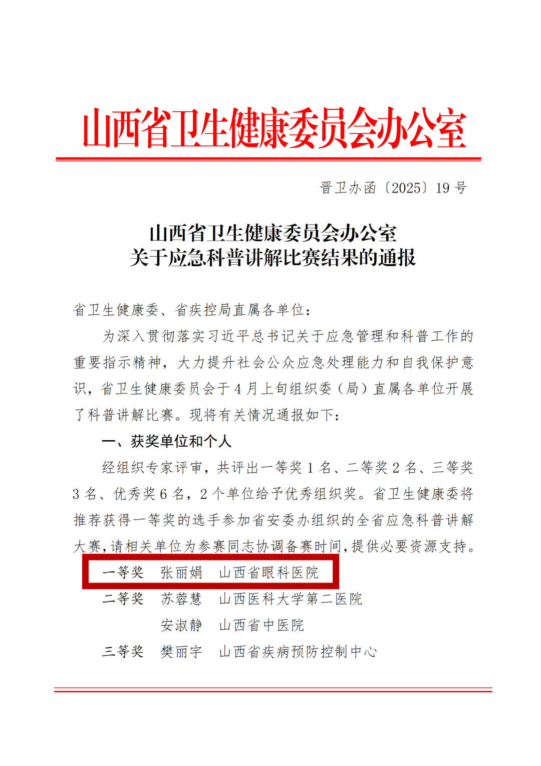本次比赛旨在深入贯彻习近平总书记关于应急管理和科普工作的重要指示精神,大力提升社会公众应急处理能力和自我保护意识。我院高度重视此次比赛,积极筛选优秀作品参赛,彰显了我院在应急科普领域的专业实力和社会担当。山西省卫健委专家经过严格评审,比赛结果正式揭晓。我院张丽娟博士的科普作品“抢救视力 争分夺秒—视网膜中央动脉阻塞的自我急救”,以专业的知识储备和生动的表达形式,将应急科普知识传递给受众,展现了医院医护人员扎实的专业素养和良好的精神风貌,最终荣获大赛唯一的一等奖。这一奖项充分肯定了医院在赛事组织、动员参与等方面付出的努力和取得的成效。