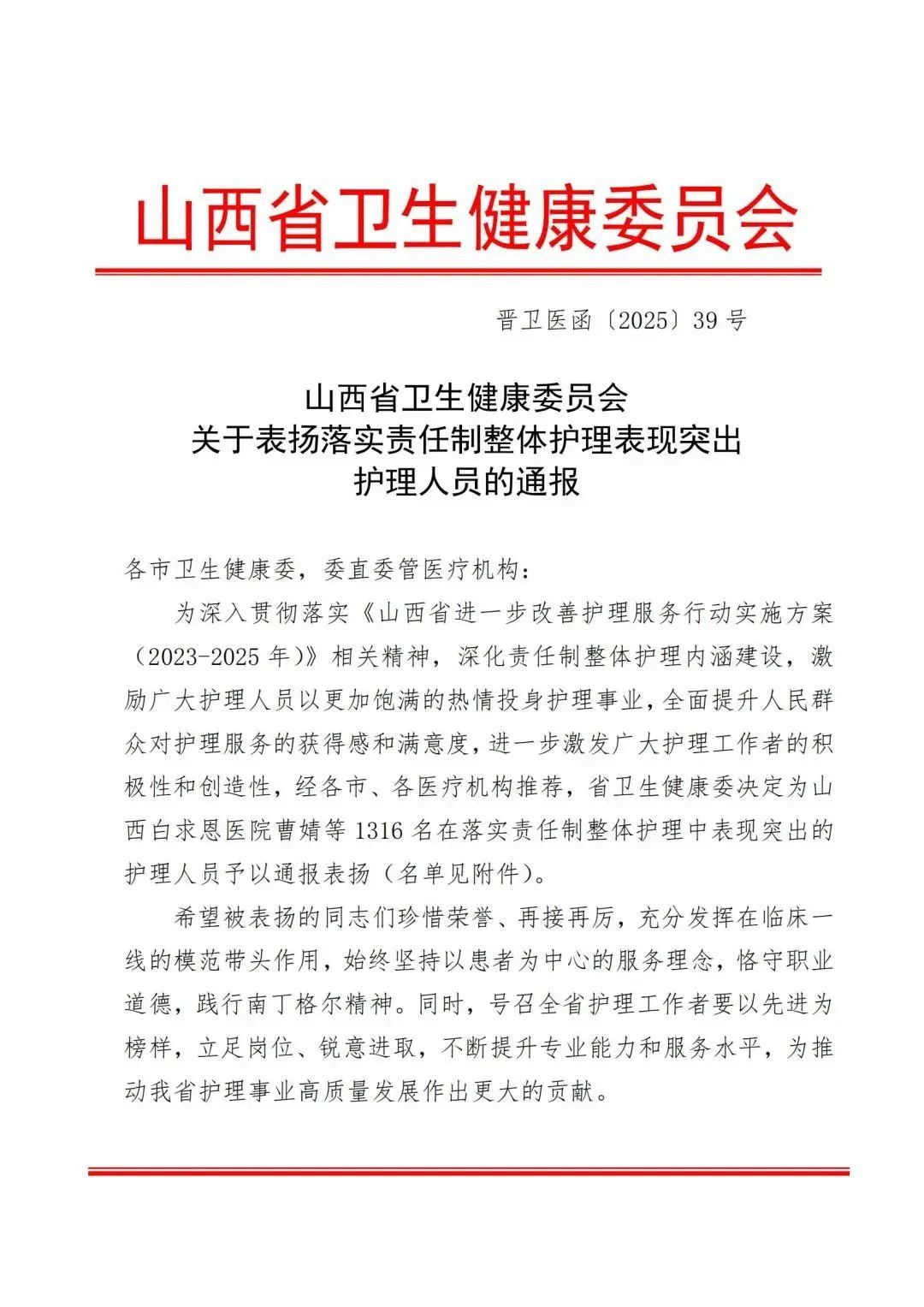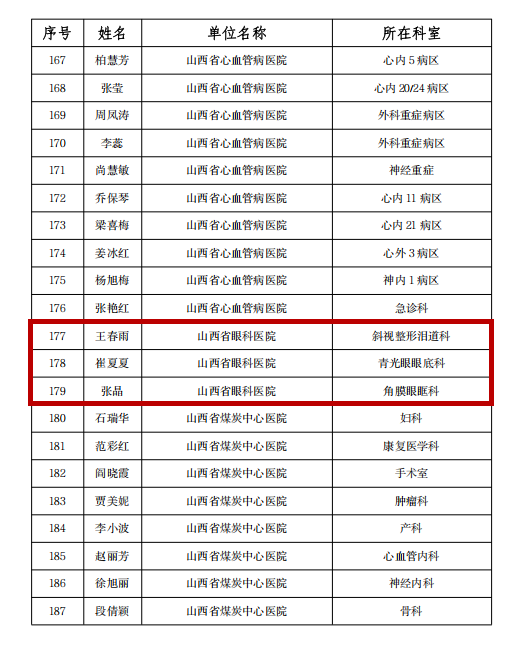 为进一步改善护理服务,深化责任制整体护理内涵,激励护理人员以更饱满的热情投身护理事业,提高人民群众对护理服务的获得感和满意度。近期,山西省卫生健康委员会对长期坚守在临床一线,落实责任制整体护理工作成绩突出的责任护士进行通报表扬。我院斜视整形泪道科王春雨、青光眼眼底病科崔夏夏、角膜眼眶科张晶三位护理人员荣登榜单。