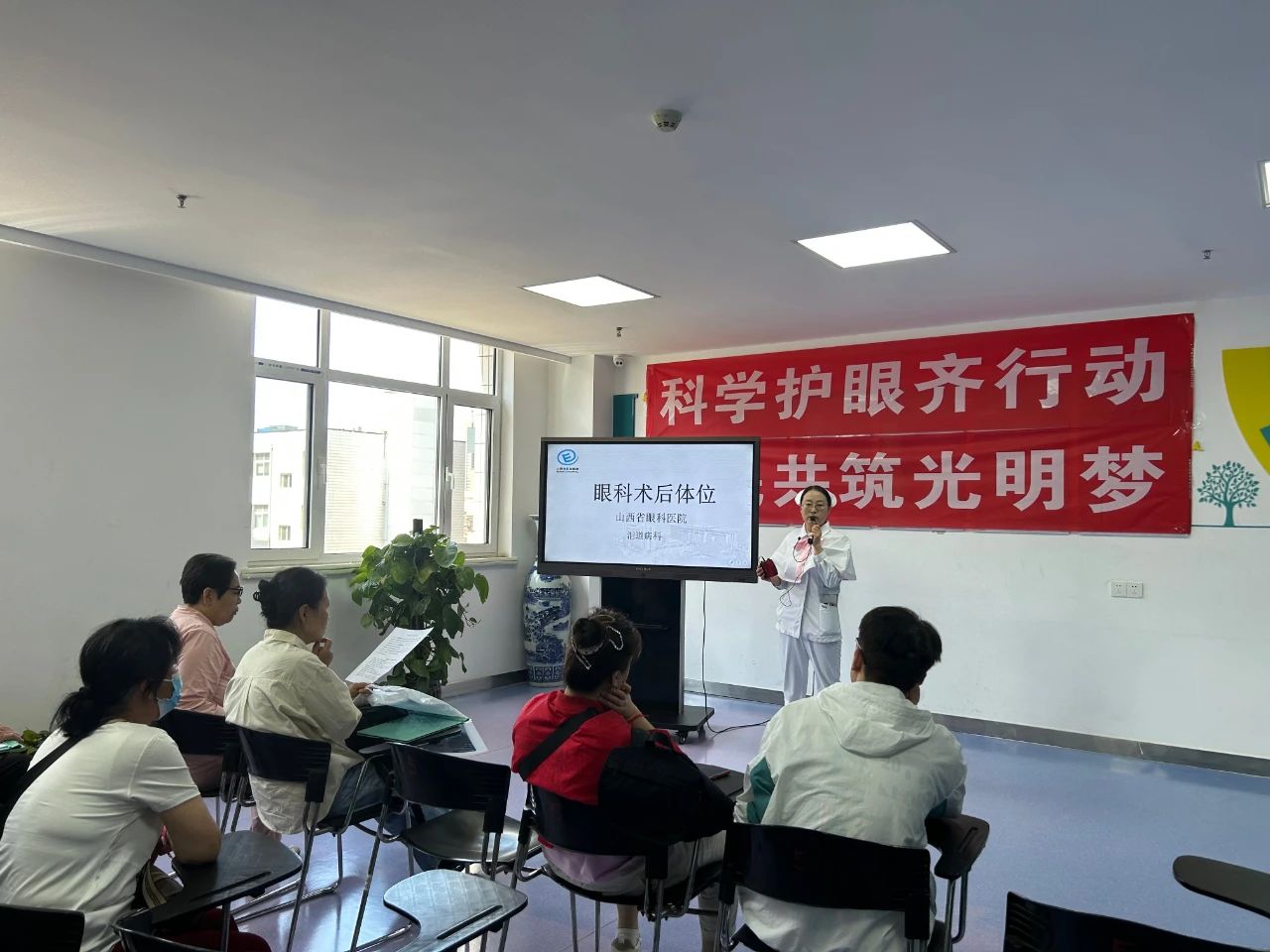 6 月 3 日,在刘亚妮护士长组织下,一场面向日间住院患者家属的健康科普讲座拉开帷幕。泪道病科王文娟医生以 “糖尿病视网膜病变 — 夺走视力的无声杀手” 为题,深讲解糖尿病及其并发症,着重强调糖尿病视网膜病变早期发现、早期治疗的重要性,让患者及家属对该病症有了更深刻的认识。张晓丽主管护师围绕 “眼科术后体位”,细致讲解正确姿势,强调其对术后康复的关键作用,为患者术后恢复提供实用指导。眼整形科王凯璐医生带来 “眼睑长了小肿块别慌 --- 读懂常见眼睑肿物” 分享,详细介绍常见眼睑肿物类型与处理方法。活动现场互动热烈,15 名医务人员耐心解答 40 名患者及家属的疑问,收获一致好评。