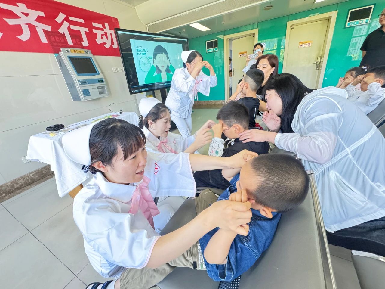 在小儿眼科门诊,斜视与小儿眼科主任冯雪亮围绕 “六六爱眼日” 主题开展科普宣讲,呼吁公众重视儿童眼健康、科学防控近视。郁昕医生以 “科学认识近视防控,守护孩子的清晰视界” 为核心,向 50 余名门诊患者及家属详细讲解高度近视危害与预防知识。张莉莎护士现场演示正确眼保健操,并带领患儿及家属一同练习,通过小礼物奖励激发大家参与热情,现场气氛热烈。活动中,小儿眼科护士发放宣传资料并答疑解惑,最后,20 名医务人员与参与者合影留念,为此次爱眼日公益活动画上圆满句号。