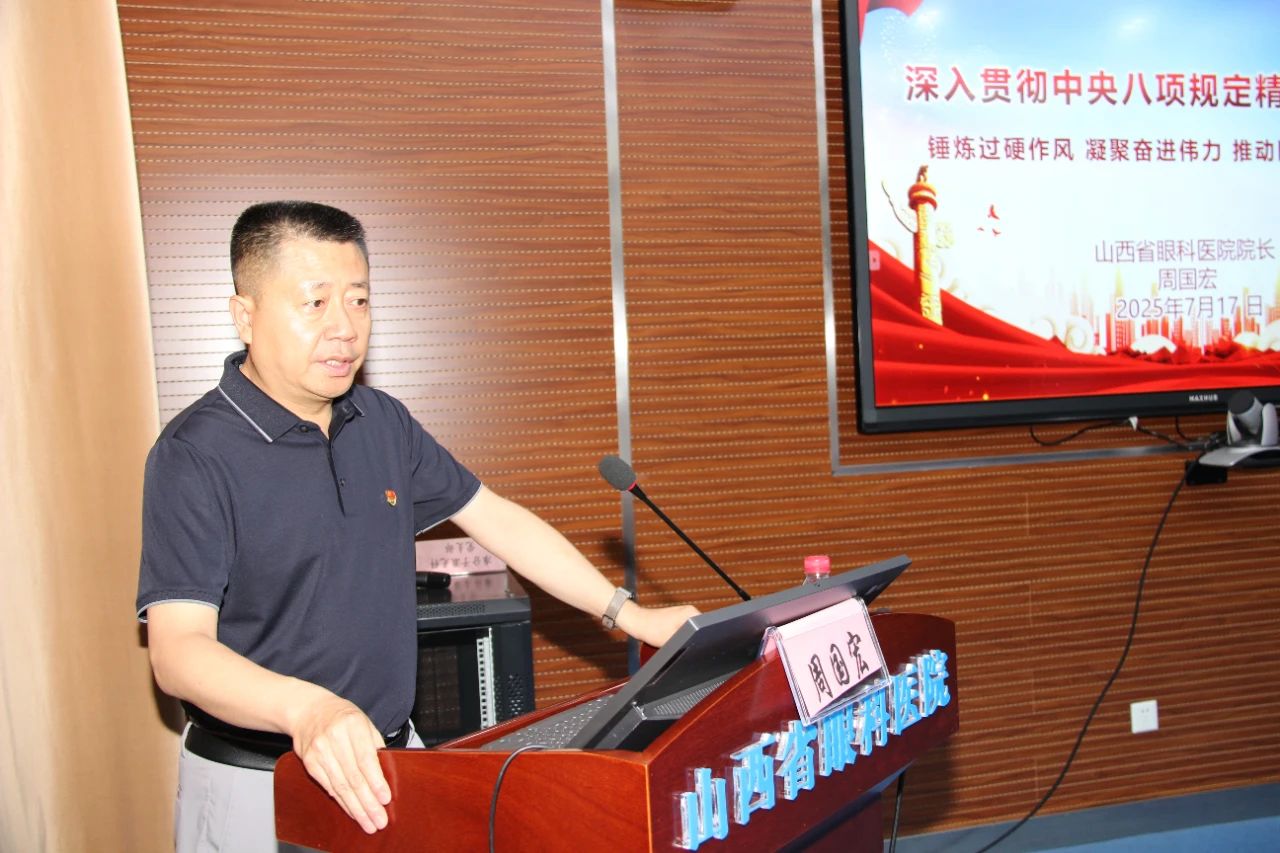 为深入贯彻落实中央八项规定精神,持续推进医院党风廉政建设,强化党员干部的纪律意识与作风建设,7 月 17 日,山西省眼科医院小儿眼科党支部、财务后勤党支部、视光党支部、麻醉手术室党支部联合举办了“深入贯彻中央八项规定精神专题学习教育专题学习会。党委副书记、院长周国宏出席活动,并作了题为《深入贯彻中央八项规定精神 —— 锤炼过硬作风 凝聚奋进伟力 推动医院高质量发展》的专题党课宣讲。