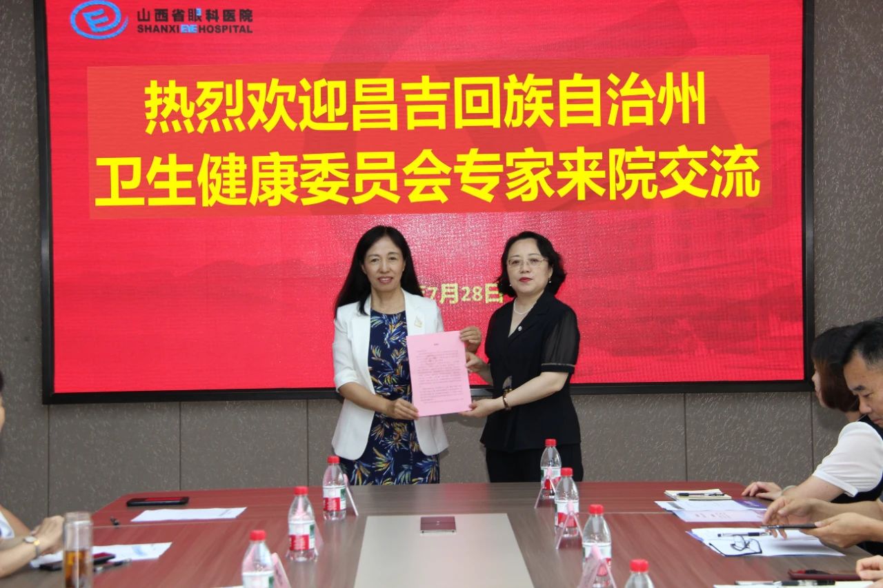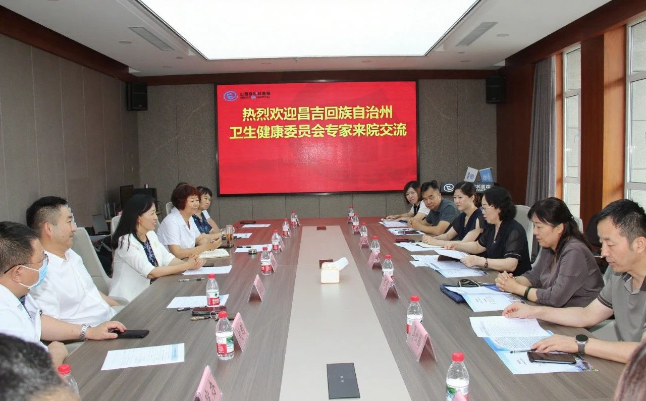 7 月 28 日,新疆自治区昌吉州中医医院党委委员、纪委书记郝卫明,吉木萨尔县总医院纪检书记王娟,吉木萨尔县中医医院副院长康文欣,昌吉州中医医院眼科主任袁新建等一行9人莅临山西省眼科医院进行调研活动。山西省眼科医院党委书记李俊红,党委委员、纪委书记李旭光、援疆专家代表及相关科室负责人参加活动,座谈会由李旭光主持。