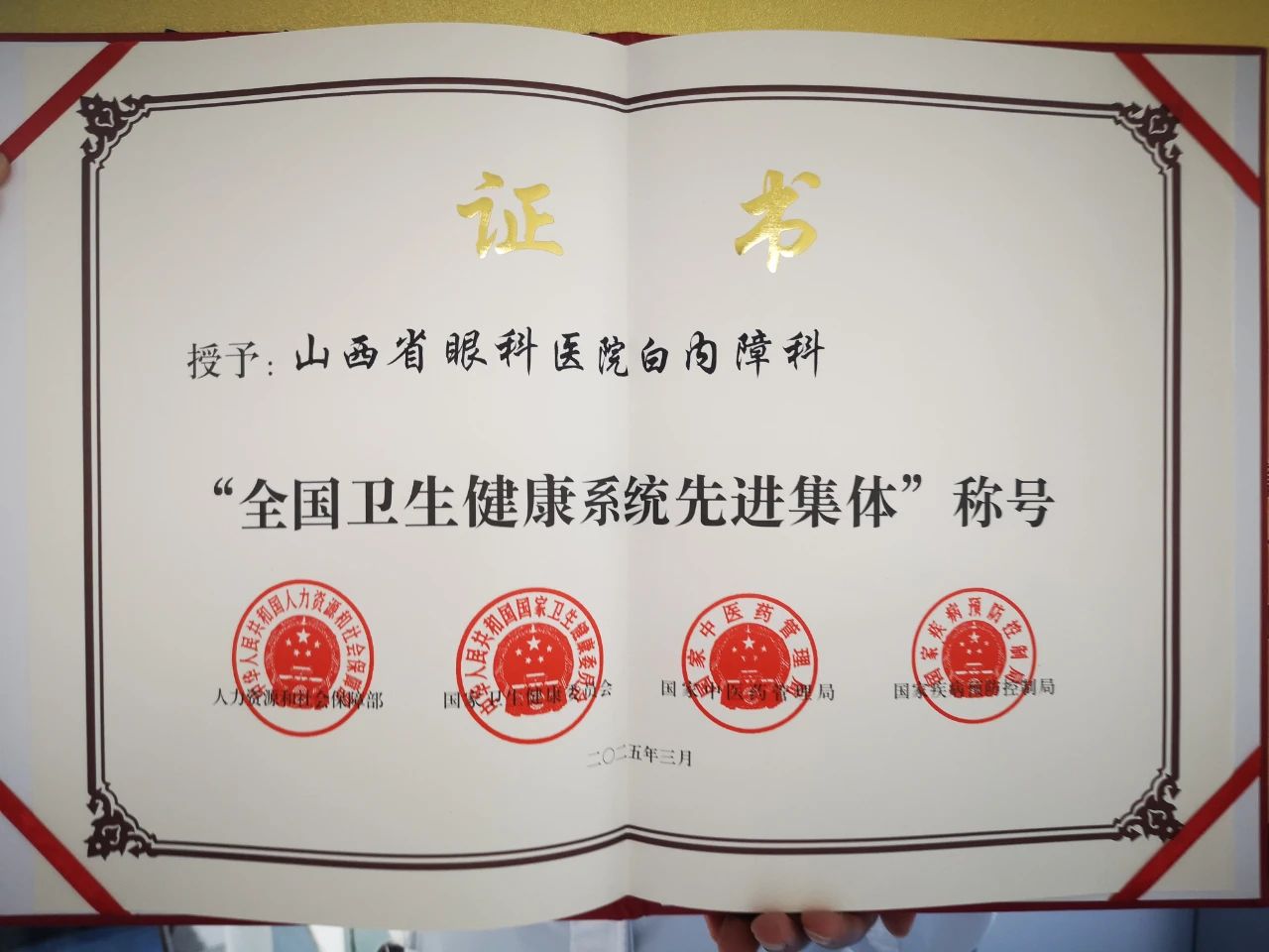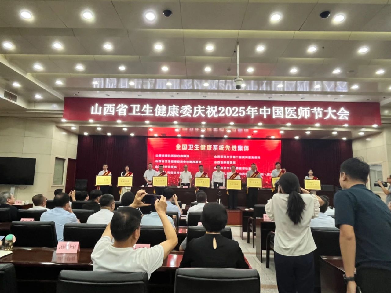 在 2025 年 8 月 19 日第八个中国医师节即将来临之际,为大力弘扬红医精神,团结凝聚广大医务工作者投身健康中国建设。山西省卫生健康委于 8 月 13 日隆重举行庆祝大会。会上,对在医疗领域作出突出贡献的先进个人与集体进行了表彰。我院白内障科主任刘杰为代表科室领取了 “全国卫生健康系统先进集体” 的殊荣奖牌。此前,人力资源社会保障部、国家卫生健康委、国家中医药局、国家疾控局联合发布决定,对全国卫生健康系统的杰出代表予以褒奖,我院白内障科在众多优秀集体中脱颖而出,这不仅是对科室专业能力的高度认可,更是激励全院医务人员在保障人民健康的道路上奋勇前行的强大动力 。