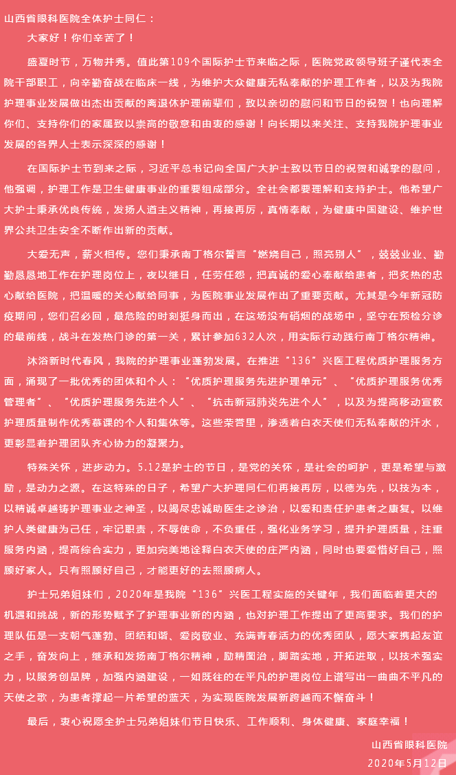 山西省眼科医院致全院护士的慰问信