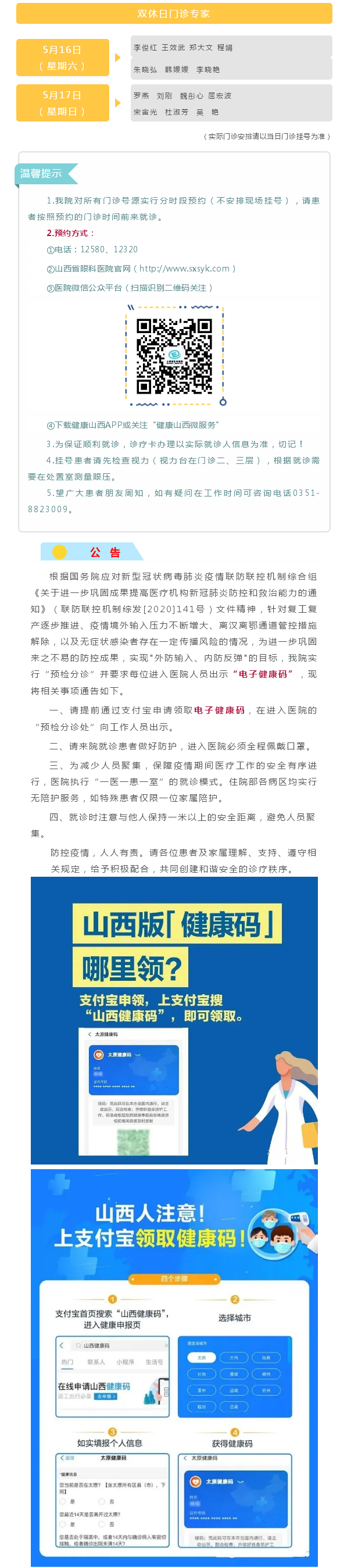 山西省眼科医院5月16日-17日双休日出诊医师信息