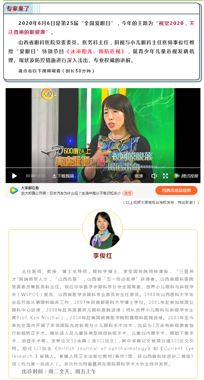 爱眼日专题|山西省眼科医院李俊红教授“健康时间”:《沐浴阳光 预防近视》
