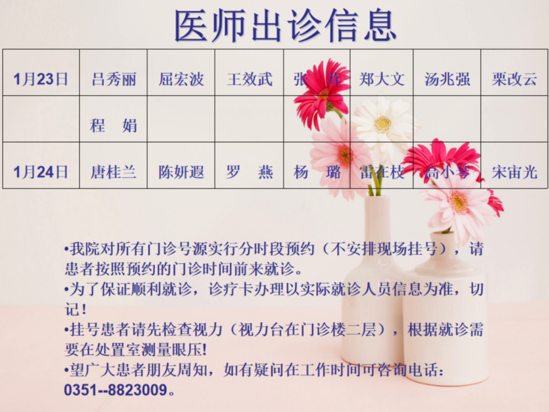 山西省眼科医院2021年1月23日-24日双休日出诊医师信息