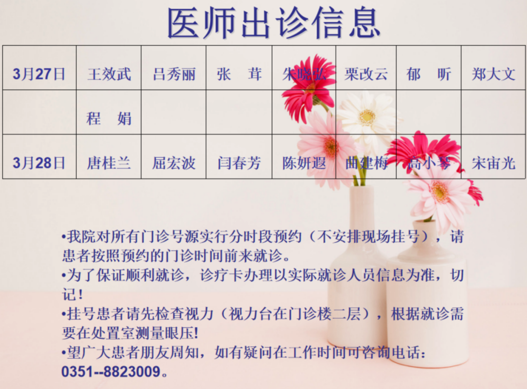 山西省眼科医院3月27日-28日双休日出诊医师信息