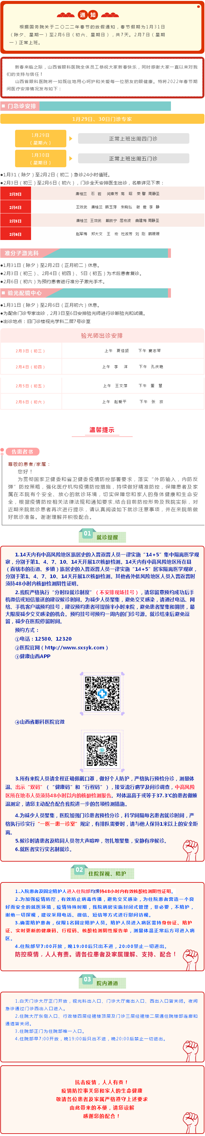 山西省眼科医院2022年春节期间门诊工作安排