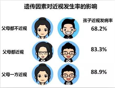 2012年中山大学和澳大利亚国立大学联合研究显示,在中国广州15岁青少年中,如果一对父母都近视,孩子近视率就会高达83.3%;如果父母有一方近视,那孩子近视率要更惨一点,88.9%;如果父母视力都很好,那孩子近视率就会下降到68.2%。