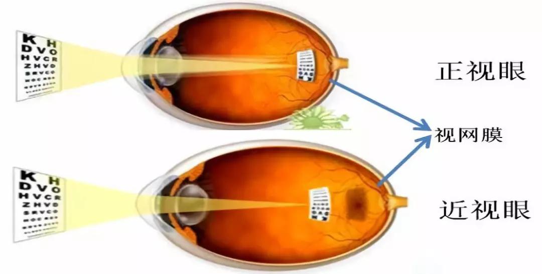 从图中我们可以发现,上下两张图中光线经过眼睛这个光学系统折射后焦点位置基本相同,而近视的焦点落在视网膜前,是由于近视的眼球比较“长”,医学中称这个长度为“眼轴”,眼轴每增长一毫米,近视就要增加约300度。所以,近视的成因是由于眼轴的变长,这个变长的眼轴就好像孩子的个子,是不可能通过休息、眼药、按摩及任何非手术的手段再变短的,因此,很遗憾,真性近视是不可能恢复的。