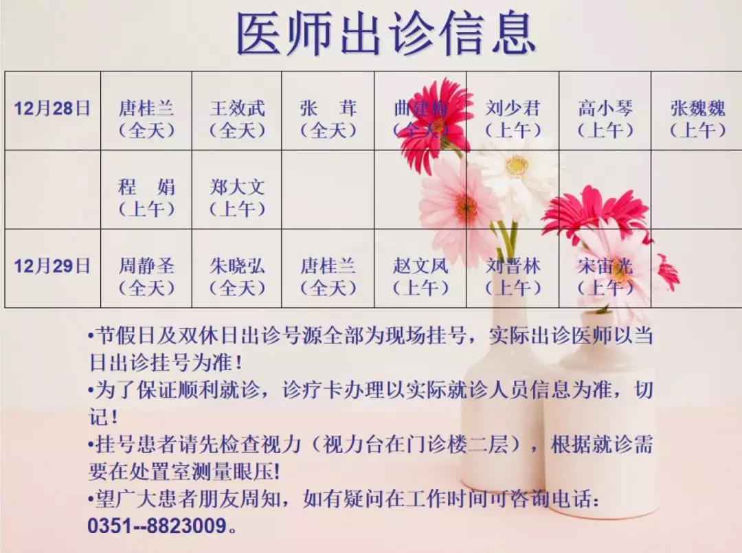 山西省眼科医院夜间门诊(12月23日~27日)医师出诊信息