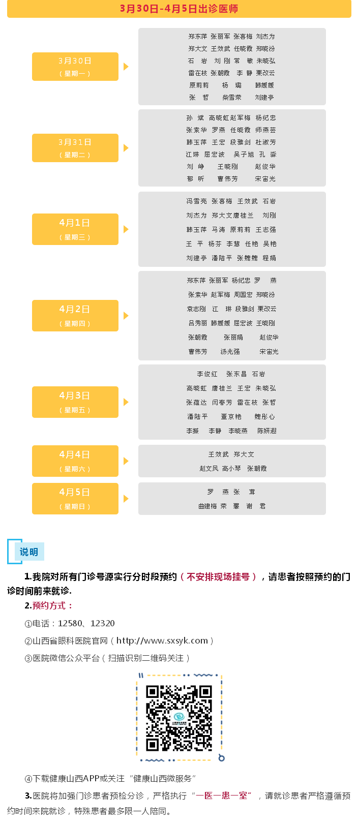山西省眼科医院3月30日-4月5日出诊医师信息