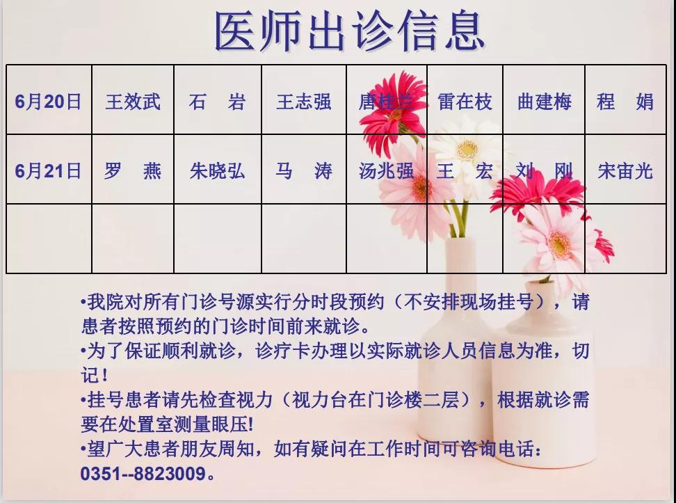 山西省眼科医院6月20日~21日双休日出诊医师信息
