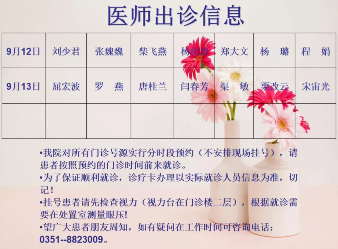 山西省眼科医院9月12日-13日双休日出诊医师信息