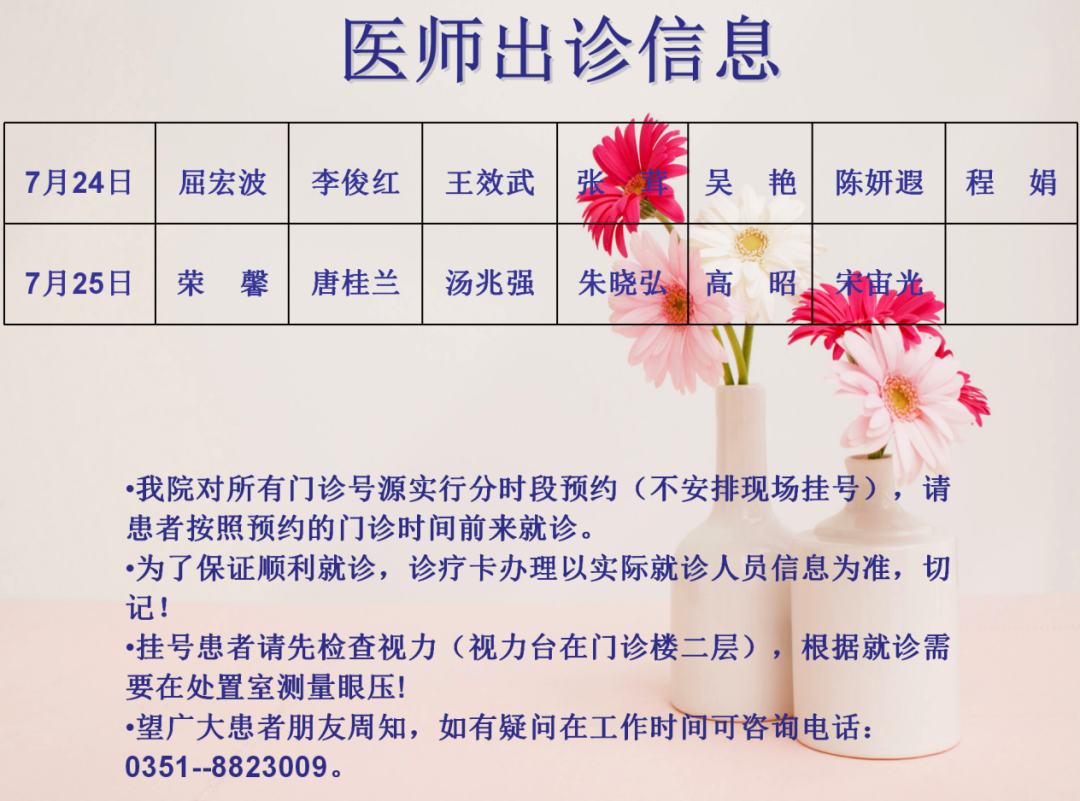山西省眼科医院7月24日~25日双休日出诊医师信息