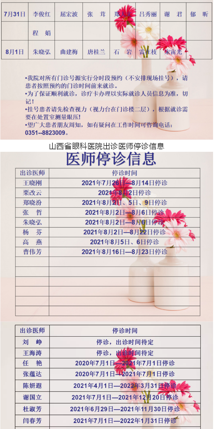 山西省眼科医院7月31日~8月1日双休日出诊医师信息