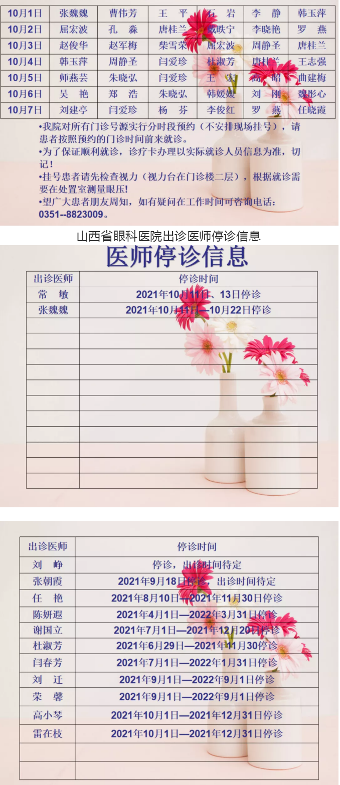 山西省眼科医院2021年“国庆节”期间出诊医师