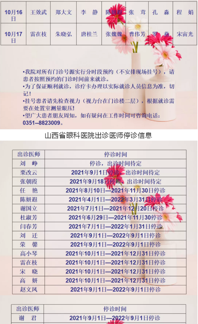 山西省眼科医院2021年“国庆节”期间出诊医师