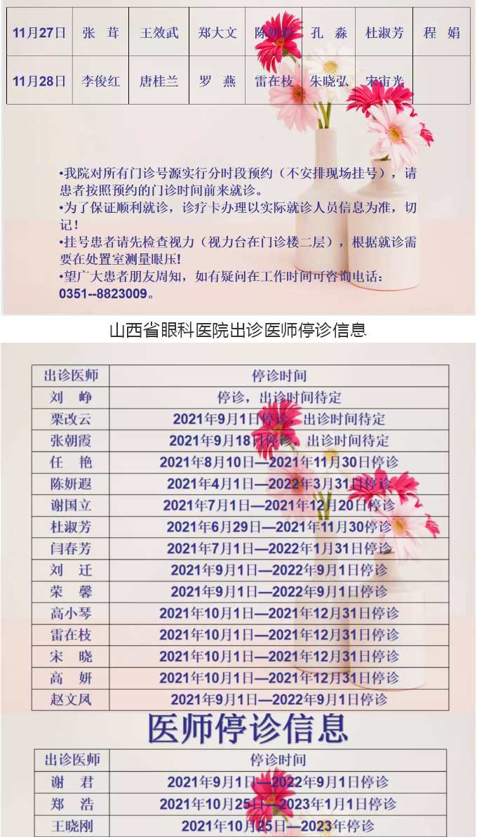 山西省眼科医院11月27日-28日双休日出诊医师信息