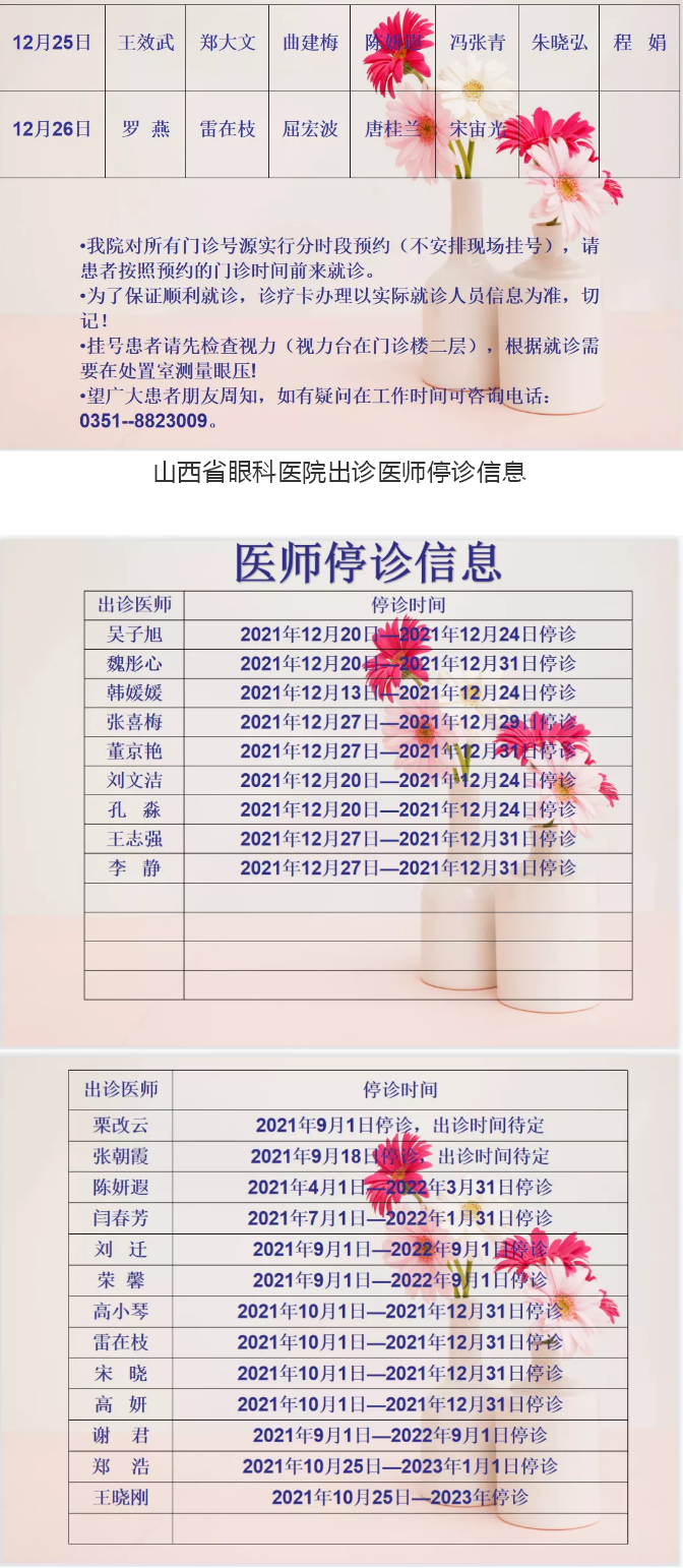 山西省眼科医院12月25日-26日双休日出诊医师信息
