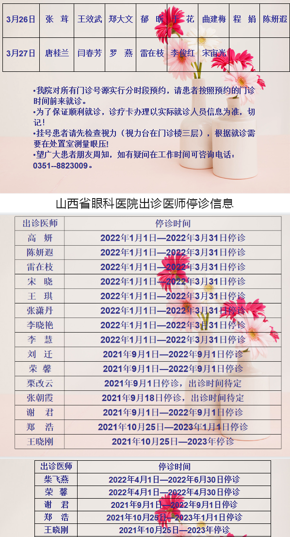 山西省眼科医院3月26日-27日双休日出诊医师信息