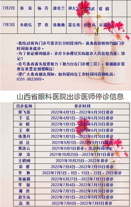 山西省眼科医院7月2日-7月3日双休日出诊医师信息