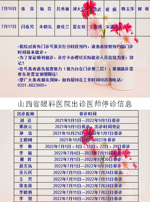 山西省眼科医院7月16日-7月17日双休日出诊医师信息