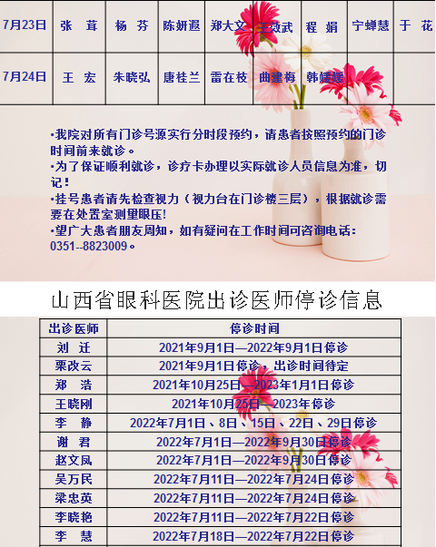 山西省眼科医院7月23日-7月24日双休日出诊医师信息