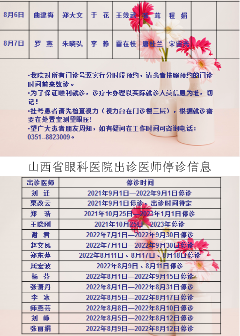 山西省眼科医院8月6日-8月7日双休日出诊医师信息