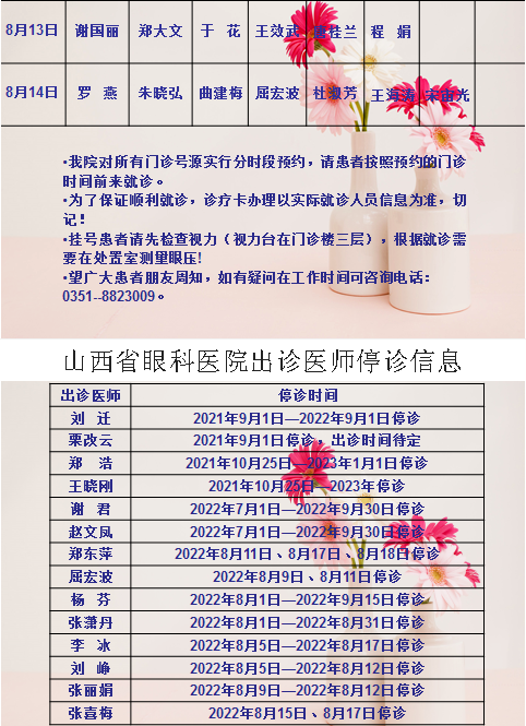 山西省眼科医院8月13日-8月14日双休日出诊医师信息