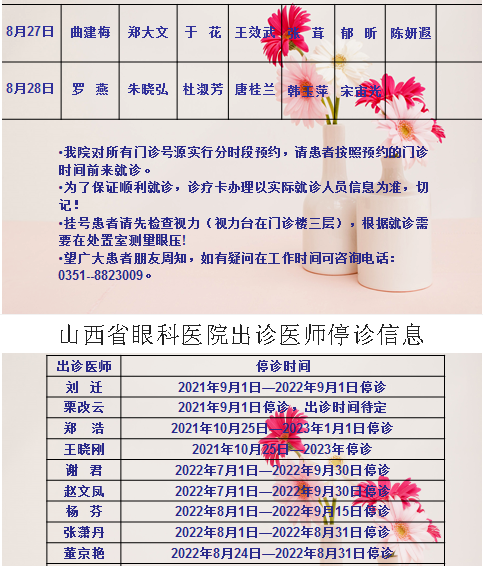 山西省眼科医院8月27日-8月28日双休日出诊医师信息