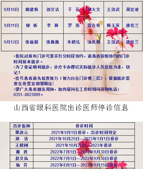 山西省眼科医院2022“中秋节”期间医师出诊信息