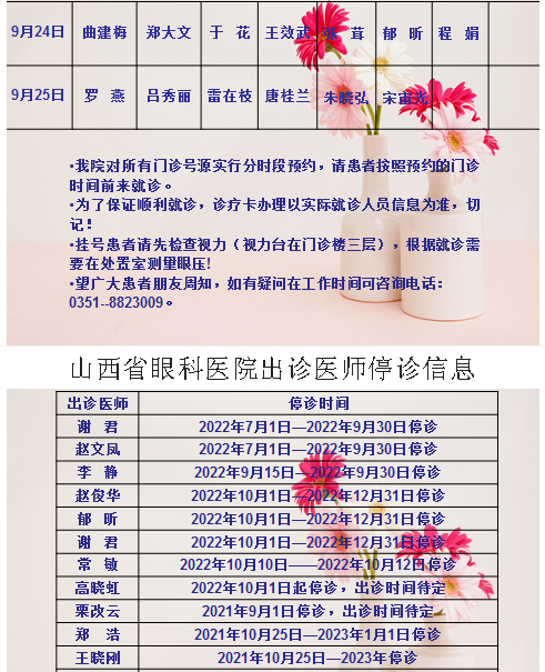 山西省眼科医院9月24日-9月25日双休日出诊医师信息