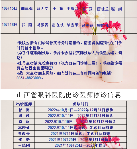 山西省眼科医院10月22日-10月23日双休日出诊医师信息