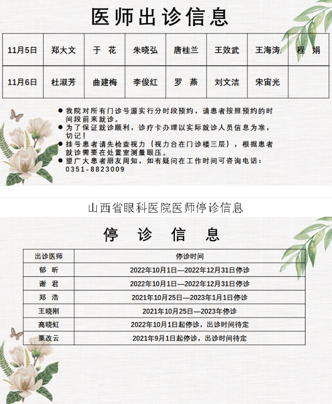 山西省眼科医院11月5日-11月6日双休日出诊医师信息