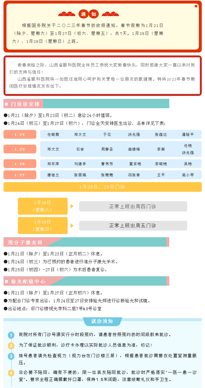 山西省眼科医院2023年1月14日-1月15日双休日出诊医师