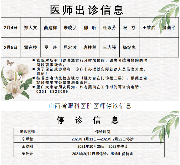 山西省眼科医院2023年2月4日-2月5日双休日出诊医师