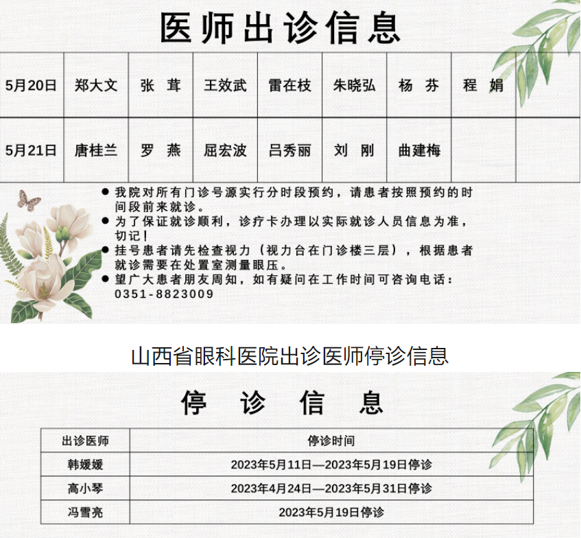 山西省眼科医院2023年5月20日-5月21日双休日出诊医师