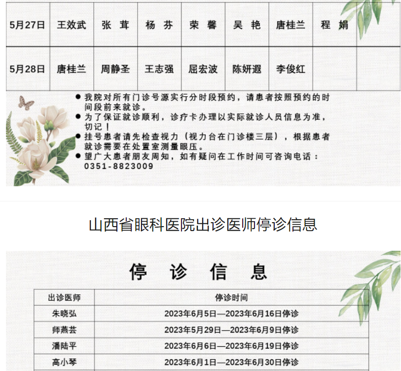 山西省眼科医院2023年5月27日-5月28日双休日出诊医师
