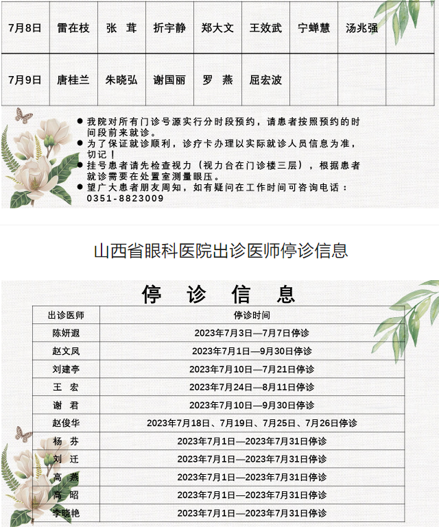 山西省眼科医院2023年7月8日-7月9日出诊医师