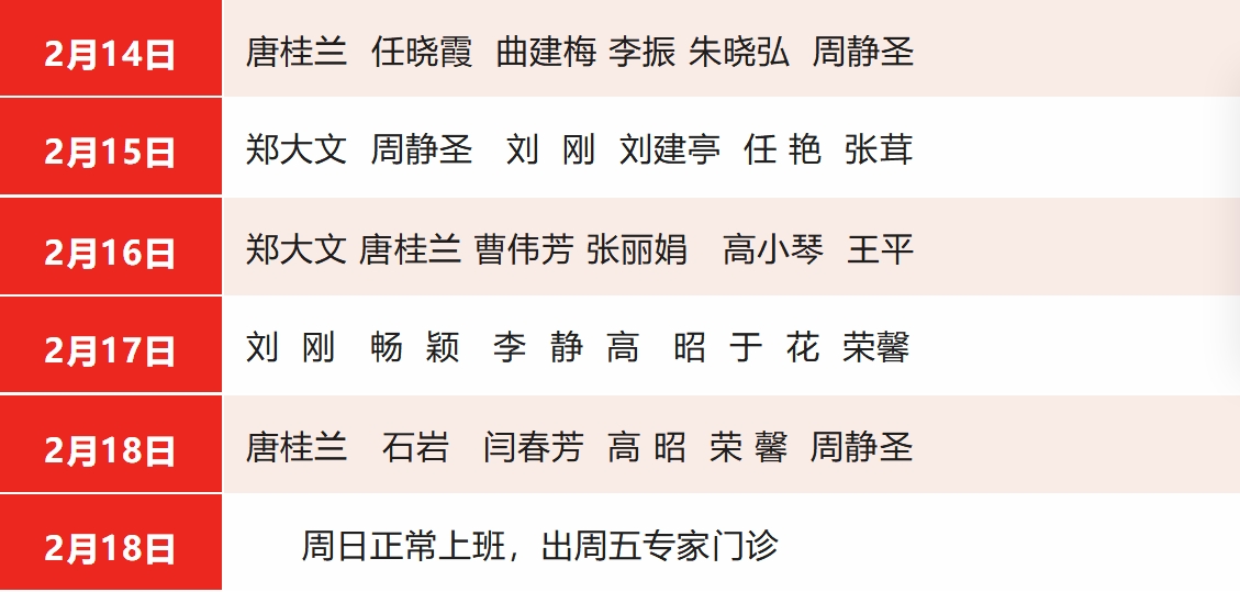 ●2月13日(初四)至2月17日(初八),门诊全天安排医生出诊,名单详见下表: