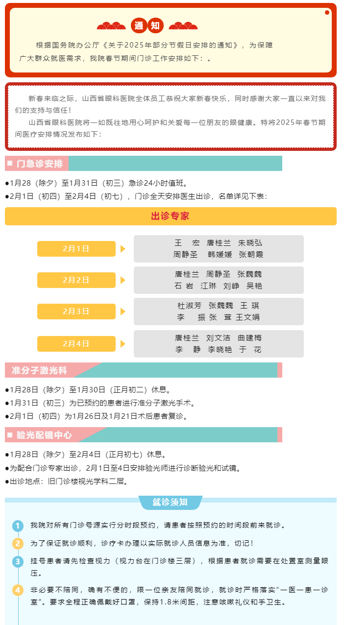 山西省眼科医院2025年春节期间门诊工作安排